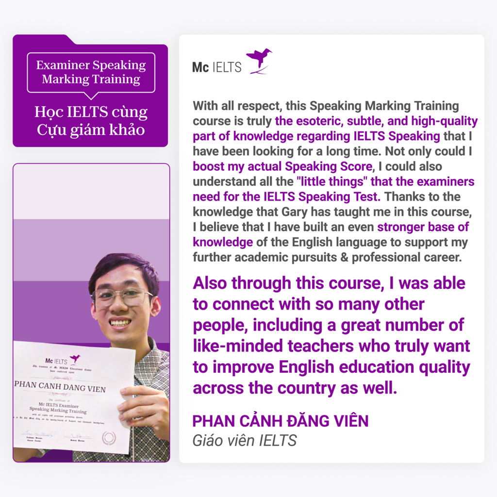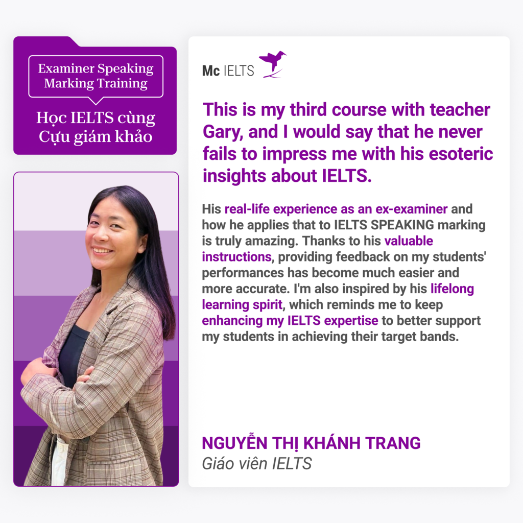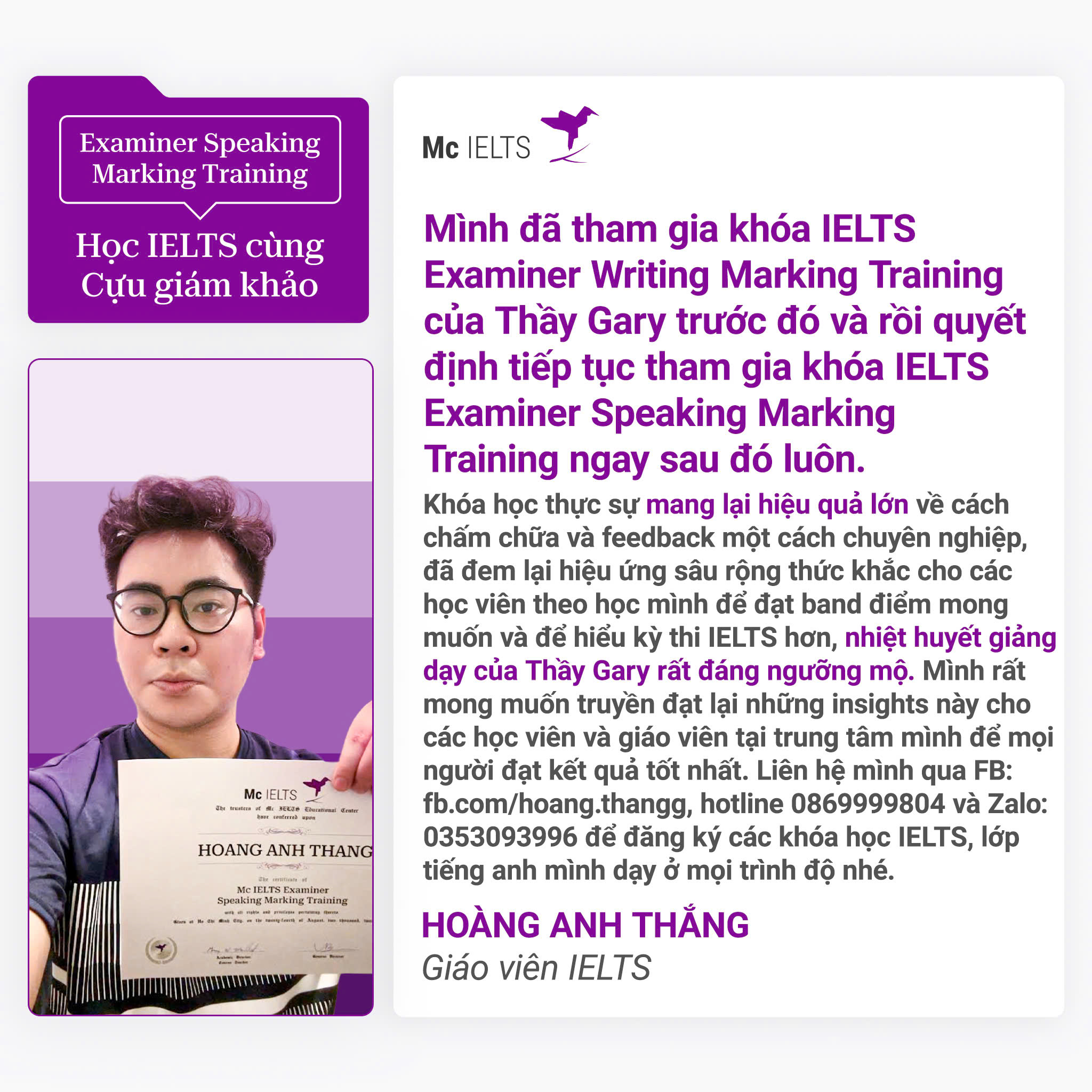 Giáo viên Việt Nam theo lý thuyết không thể apply làm giám khảo IELTS, nhưng bạn vẫn có thể tiếp cận các kiến thức chấm thi chuẩn thông qua khóa training của Mc IELTS.